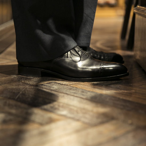 レザーシューズに、スーツ、ネクタイとビシッとした感じなのに、